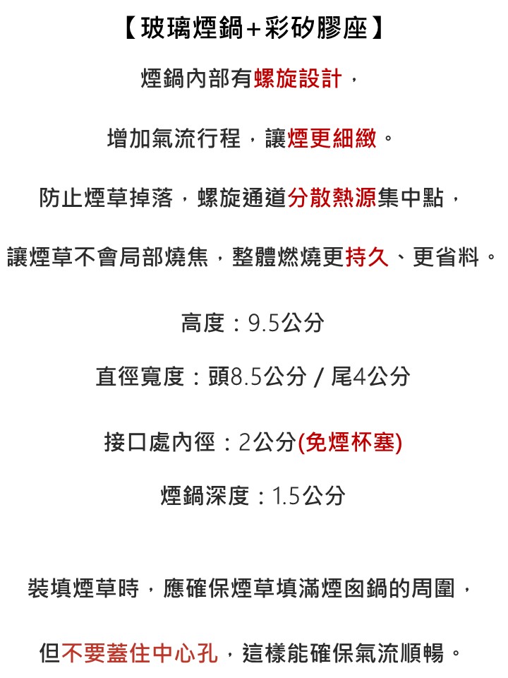煙鍋裡的螺旋設計有助於導流與均勻燃燒,讓熱氣循環更順、菸草受熱更均勻,延長吸煙時間、風味更穩定。玻璃保留純淨煙味、不易吸附異味,矽膠座耐熱、防滑、緩衝力佳,方便拆裝也更耐摔。