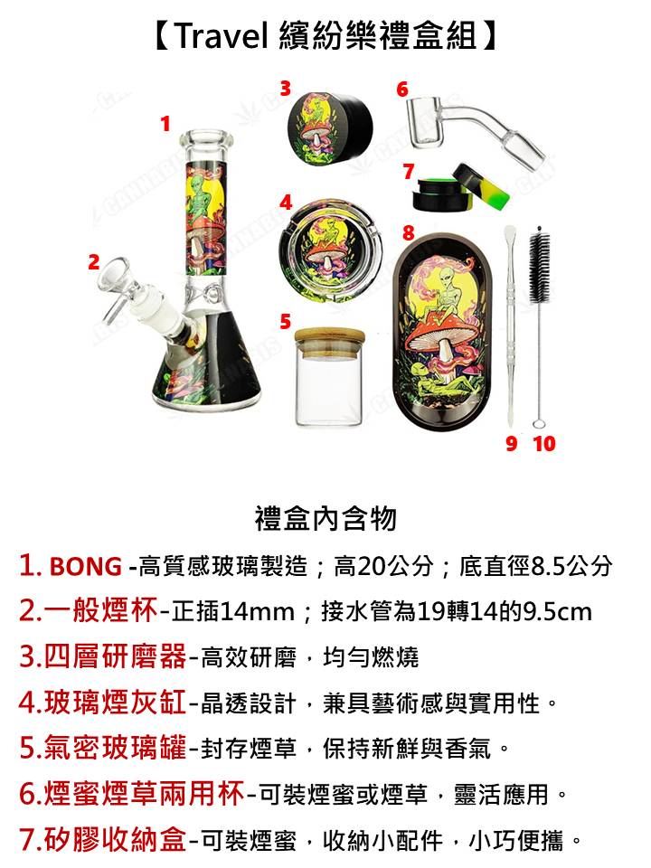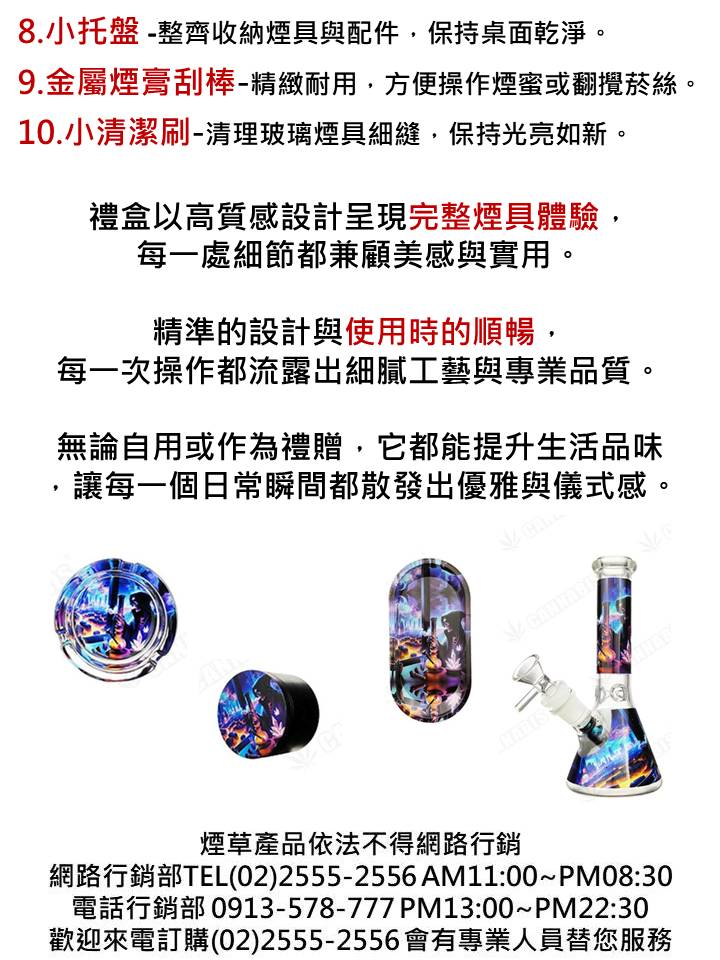 BONG 、玻璃煙灰缸、 一般煙杯、煙蜜煙草兩用杯、四層研磨器、小托盤、小清潔刷、金屬煙膏刮棒、矽膠收納盒、氣密玻璃罐