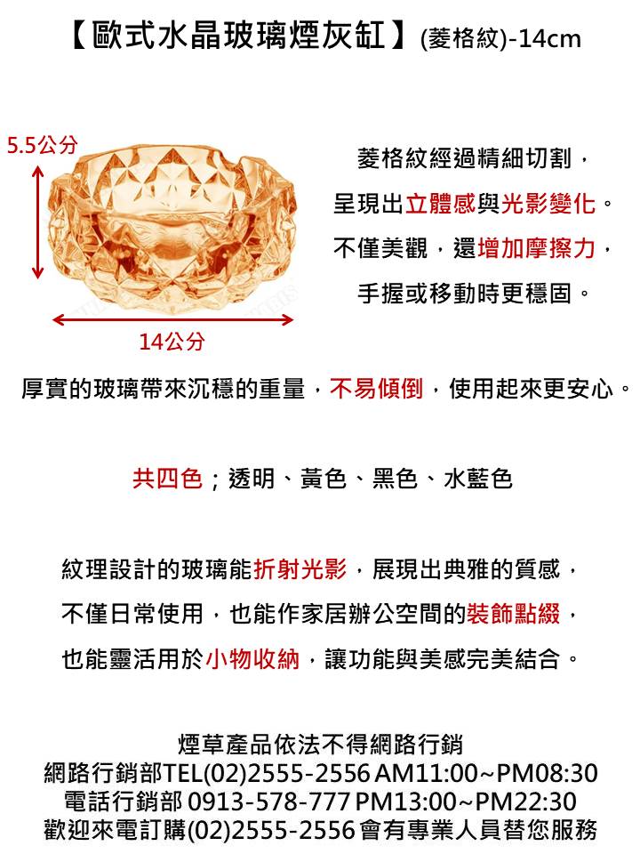 晶瑩剔透,光線折射下呈現優雅光澤。菱格紋設計,既經典又帶有歐式格調,桌面擺放即像裝飾品,提升空間質感。經典菱格紋切割工藝,不只是煙灰缸,更像藝術擺件,完美融入家居。玻璃材質安全耐熱,不怕煙灰燙傷,表面光滑,清理簡單方便,長時間使用仍保持亮麗如新。