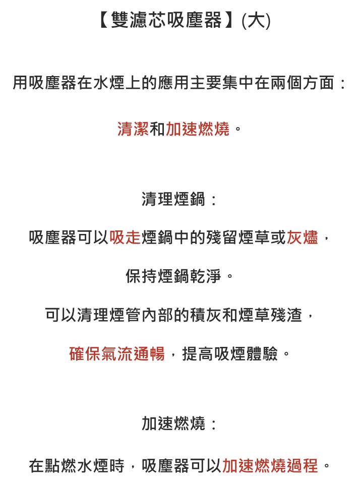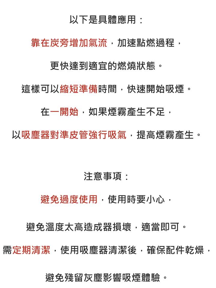 主要應用集中在兩個方面:清潔和加速燃燒。吸塵器可以用來吸走煙鍋中殘留的灰燼,保持煙鍋乾淨。吸塵器也可以用來加速燃燒過程。使其更快達到適宜的燃燒狀態。這樣可以縮短準備時間,快速開始吸煙。
