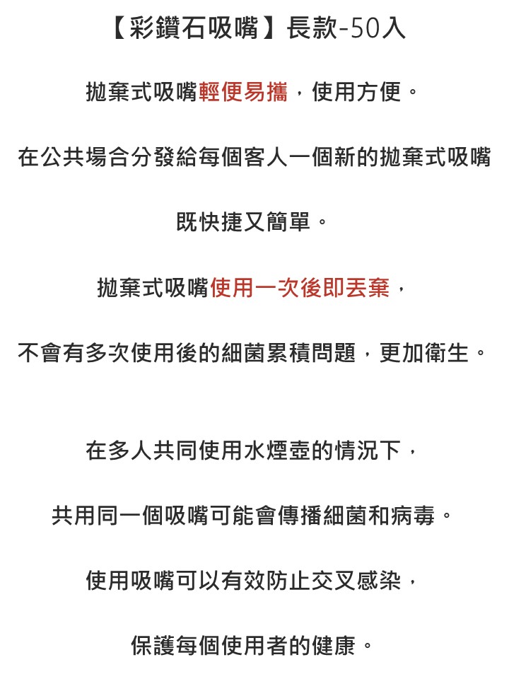 拋棄式吸嘴使用一次後即丟棄,不會有多次使用後的細菌累積問題,這樣更加衛生。當多人共同享用水煙時,每個人都可以使用自己的吸嘴,這樣可以避免直接接觸到其他人的口水,保持個人衛生。