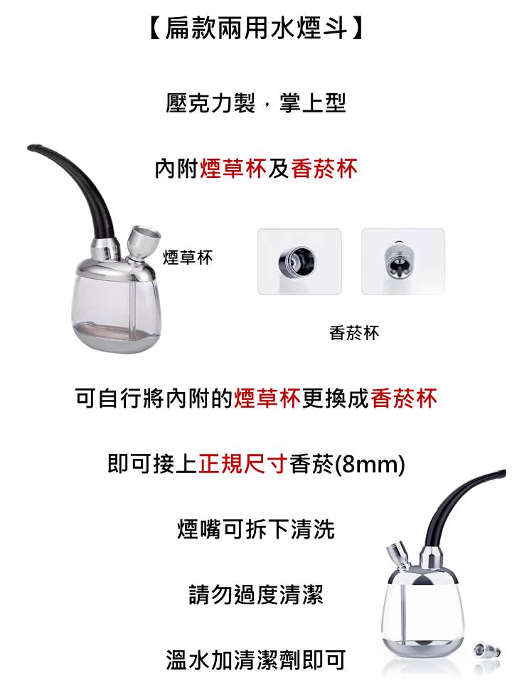 壓克力製,全可拆。可以接香菸或是放菸草使用。水煙斗的設計旨在通過水來過濾和冷卻煙霧,從而提供更柔和、更舒適的吸煙體驗。