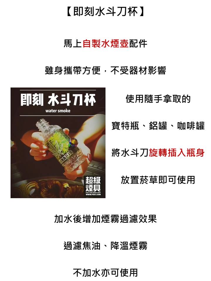 只有6公分,想抽就抽不設限。將水斗刀鑽進寶特瓶上,塑膠的柔軟保證絕對的氣密效果。不加水使用就像一般菸斗,加水後即有過濾煙霧之效果。居家旅行必備小物。