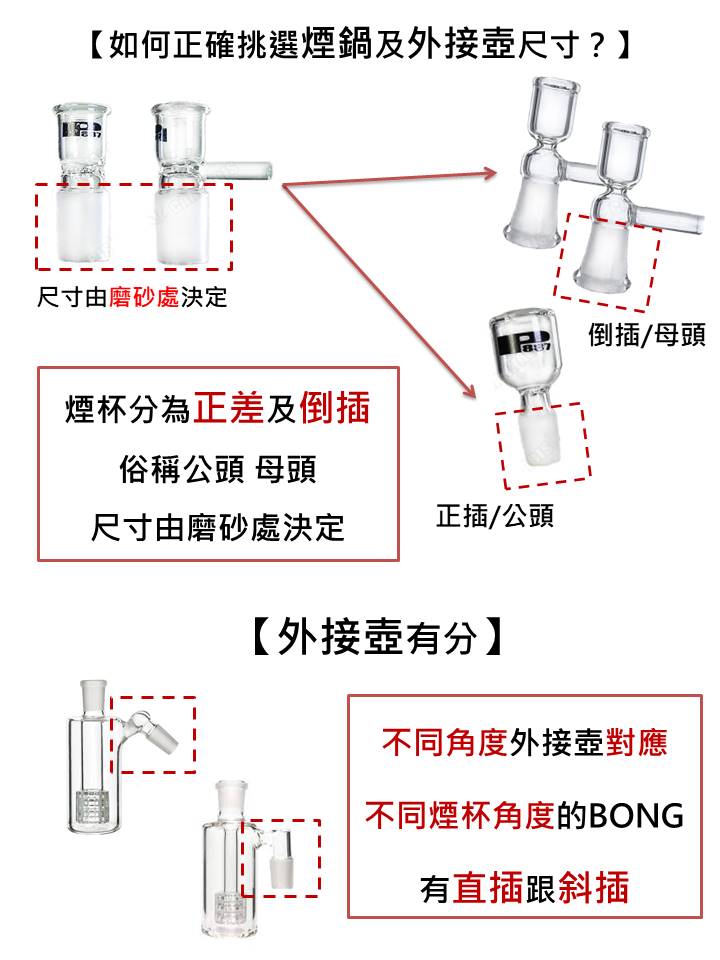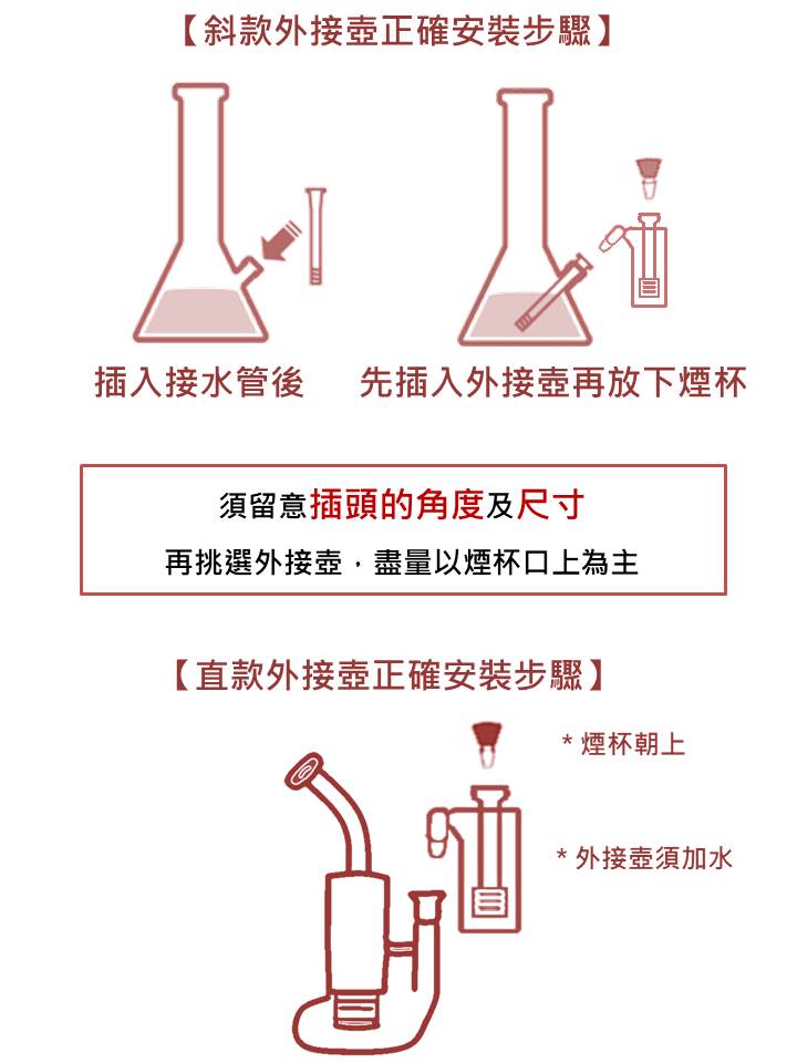 外接過濾管通常被稱為接灰器「ash catcher」,除了二次過濾以外,有助於保護主煙具,減少清潔的頻率,並提升整體使用體驗。確保BONG的接管尺寸和外接壺的尺寸匹配。